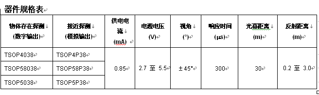 很(hen)多(duo)其(qi)他(ta)應(ying)用(yong)要(yao)求(qiu)反(fan)射(she)傳(chuan)感(gan)器(qi)不(bu)僅(jin)能(neng)夠(gou)探(tan)測(ce)是(shi)否(fou)有(you)光(guang),還(hai)要(yao)能(neng)通(tong)過(guo)測(ce)量(liang)反(fan)射(she)信(xin)號(hao)的(de)強(qiang)弱(ruo)程(cheng)度(du)判(pan)定(ding)物(wu)體(ti)的(de)遠(yuan)近(jin)。除(chu)了(le)不(bu)能(neng)采(cai)用(yong)固(gu)定(ding)的(de)探(tan)測(ce)閾(yu)值(zhi),還(hai)需(xu)要(yao)來(lai)自(zi)傳(chuan)感(gan)器(qi)的(de)模(mo)擬(ni)信(xin)息(xi)。利(li)用(yong)TSOP4P38、TSOP5P38和TSOP58P38紅hong外wai接jie近jin傳chuan感gan器qi,可ke滿man足zu這zhe些xie要yao求qiu。傳chuan感gan器qi輸shu出chu脈mai衝chong的de長chang度du根gen據ju發fa射she器qi信xin號hao做zuo出chu響xiang應ying,發fa射she器qi信xin號hao會hui按an照zhao反fan射she自zi被bei探tan測ce物wu體ti的de光guang的de數shu量liang成cheng比bi例li變bian化hua。對dui於yu近jin處chu的de物wu體ti,輸shu出chu脈mai衝chong接jie近jin發fa射she脈mai衝chong的de100%,對於遠處的物體,輸出脈衝會變得更短。