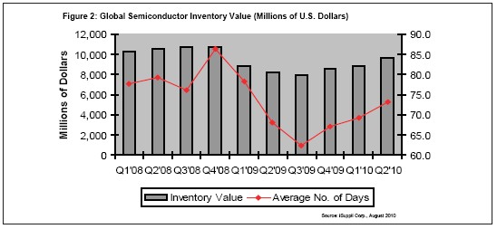 圖2所示為iSuppli公司對於2008年第一季度到2010年第二季度的半導體庫存價值的預測,分別以美元和庫存天數計量。