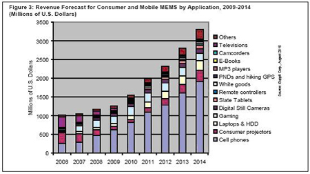 但是,消費與移動MEMS預計到2014年將成為最大的MEMS領域,現在已是最大的MEMS市場之一。感測器已進入日常設備之中,如筆記本電腦、MP3播放器、遙控器和便攜導航設備。