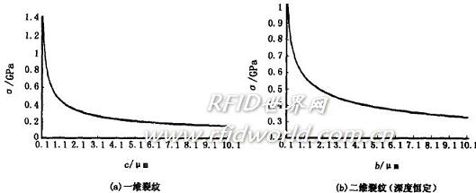 對於碎裂麵垂直於芯片表麵,深a、長2b的二維半橢圓型裂紋而言,則滿足Ccr=[(Φ2KIC2)/(1。2πσIC2)][2],其中Ccr=(acrbcr)1/2,acr為臨界裂紋深度,bcr為臨界裂紋半長;裂紋幾何因子Φ=(1。2π)1/2/Y。設裂紋長為2b,深度恒定為1μm,代入斷裂韌度KIC=0。82MPa,Y=1。42得,平麵應力狀態常載荷條件下碎裂的臨界強度σ=0。58/4b(GPa)可見,芯片碎裂臨界強度隨著微裂紋長度的增大而急劇降低,當裂紋大於1μm時,下降趨勢逐漸平緩,並趨於穩定小值。