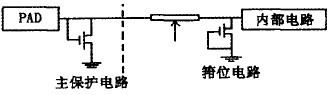 防護ESD的一種有效方法,即設計特定的保護電路。圖10即為一種基於CMOS工藝的IC卡芯片ESD保護電路7。該結構包括兩個部分:主保護電路和箝拉電路。在ESD發生時,箝拉電路首先導通,使輸入端柵上的電壓箝拉在低於柵擊穿的電壓。中間的串聯電阻起限流作用,更重要的是使PAD上的電壓能觸發主保護電路的開啟,使ESD能量通過主保護電路得到釋放。