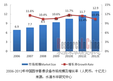 水清木華研究中心指出,近年來,在社會需求劇增、行業利潤豐厚以及醫改的背景下,中國醫學影像設備行業獲得高度發展。2006至2009年期間,行業市場規模從68.7億元人民幣增長至94.2億元人民幣,2006-2009年複合年增長率為10.9%,預計到2012年仍能保持10.4%的增長速度。
