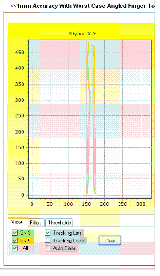 精確度:精(jing)確(que)度(du)可(ke)定(ding)義(yi)為(wei),在(zai)一(yi)個(ge)預(yu)先(xian)定(ding)義(yi)的(de)觸(chu)摸(mo)屏(ping)區(qu)域(yu)中(zhong)最(zui)大(da)的(de)定(ding)位(wei)誤(wu)差(cha),以(yi)手(shou)指(zhi)的(de)實(shi)際(ji)位(wei)置(zhi)與(yu)測(ce)量(liang)位(wei)置(zhi)之(zhi)間(jian)的(de)直(zhi)線(xian)距(ju)離(li)為(wei)單(dan)位(wei)。在(zai)測(ce)量(liang)精(jing)確(que)度(du)時(shi),使(shi)用(yong)的(de)是(shi)一(yi)隻(zhi)模(mo)擬(ni)或(huo)機(ji)械(xie)手(shou)指(zhi)。手(shou)指(zhi)置(zhi)於(yu)麵(mian)板(ban)上(shang)的(de)一(yi)個(ge)準(zhun)確(que)位(wei)置(zhi),再(zai)把(ba)手(shou)指(zhi)實(shi)際(ji)位(wei)置(zhi)與(yu)測(ce)量(liang)位(wei)置(zhi)進(jin)行(xing)比(bi)較(jiao)。精(jing)確(que)度(du)非(fei)常(chang)重(zhong)要(yao),使(shi)用(yong)者(zhe)希(xi)望(wang)係(xi)統(tong)能(neng)準(zhun)確(que)地(di)找(zhao)到(dao)手(shou)指(zhi)位(wei)置(zhi)。電(dian)阻(zu)式(shi)觸(chu)摸(mo)屏(ping)最(zui)令(ling)人(ren)詬(gou)病(bing)的(de)一(yi)項(xiang)缺(que)點(dian),就(jiu)是(shi)低(di)準(zhun)確(que)度(du),而(er)且(qie)準(zhun)確(que)度(du)會(hui)隨(sui)時(shi)間(jian)逐(zhu)漸(jian)減(jian)弱(ruo)。電(dian)容(rong)式(shi)觸(chu)摸(mo)屏(ping)的(de)精(jing)確(que)度(du)創(chuang)造(zao)出(chu)許(xu)多(duo)新(xin)應(ying)用(yong),例(li)如(ru)虛(xu)擬(ni)鍵(jian)盤(pan),以(yi)及(ji)不(bu)用(yong)觸(chu)控(kong)筆(bi)的(de)手(shou)寫(xie)辨(bian)識(shi)。圖(tu)1顯示一個結構不完整的觸控麵板數據,顯示手指位置有遊移現象,而實際上模擬手指是進行直線移動。