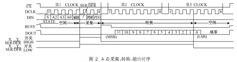 如圖 1示。ADS7843串行接口的一次完整操作需要 3× 8=24個 DCL K時鍾周期,前 8個脈衝接收 8位的命令,並在第 6個脈衝的上升沿開始 A / D轉換器進入采樣階段,從第 9個脈衝開始進入轉換階段,輸出12位采樣值,轉換結束進入空閑階段。直到 24個DCL K結束,CS置高電平,一次測量結束。如圖 2所示。此外,ADS7843還支持其他的工作方式,這裏不再詳述。