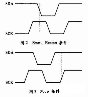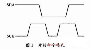 (1)傳輸開始。在SCK為高時使SDA由高電平變為低電平,並在下一個SCK為高時將SDA升高,如圖1所示。
