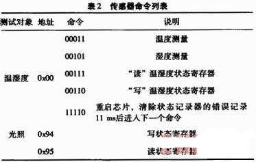 (2)地址與測試對象命令。該命令包含3個地址位和5個命令位,其後為應答ACK位,表示SHT11正確收到命令。傳感器命令列表,如表2所示。