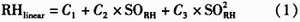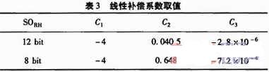 式中,RHlinear為經過線性補償後的濕度值,SORH為相對濕度測量值,C1,C2和C3為線性補償係數,取值如表3所示。