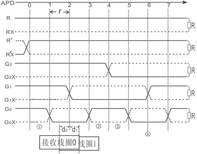在t0、t1、t2、t3、t4時間段,分別向傳輸對線R、R’、G2、G1、G0發送載波信號,在t5時間段不發送。車上天線箱中有兩個接收線圈:接收線圈0和接收線圈1。APD檢測是從接收線圈0感應信號的相位中得到APD位置。在t0時間段,線圈0感應的是R線發送的信號,稱為R信號;在t1時間段,線圈0感應的是R’信號,R’信號與R信號反相,記為=1,作為起始位;在t2時間段,線圈0感應的是G2線發送的信號,G2=0或1,取決於接收線圈0的位置。若接收線圈0的中線分別在①、②、③、④的位置,則接收線圈0的接收信號的相位如圖3所示。