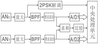 感應無線位置檢測係統電路框圖如圖5所示。當中控室地麵局開始發送載波信號時,DCD=1;CPU檢測到DCD後,對2PSK解調輸出檢測,將第1個1作為起始位進行串行數據接收,得到APD位置數據g;在檢測G0的時間段,啟動A/D1和A/D2,從A/D1和A/D2讀出接收線圈0接收的信號幅度A(AN0)和接收線圈1接收的信號幅度A(AN1),將各數據代入公式(5)~(8),可得移動機車位置ADD。