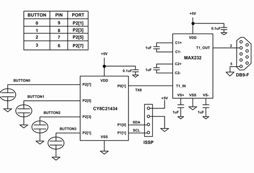 為了實現電容式傳感和串行通信,該電路采用了賽普拉斯的CY8C21x34係列中的PSoC IC芯片。該芯片包含一組模擬和數字功能塊,這些功能塊可由存儲於板上閃存中的固件來配置。另一顆芯片負責處理RS232的電平移位,以便建立到主機的通信鏈接,並實現波特率為115,200的電容式傳感數據記錄。四個電容傳感按鍵的引腳分配在圖5的表中給出。PSoC是通過一個包含電源、地以及編程引腳SCL和SDA的ISSP接頭來實現編程的。而通過一個DB9連接器將電腦與電容式傳感電路板相連。