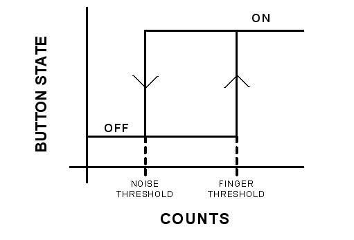在圖9a中,按鍵初始狀態為斷(OFF)狀態。超過手指門限的差分計數的第一個采樣把按鍵狀態轉換至通(ON)狀態。在圖9b中,低於噪聲門限的差分計數的第一個采樣將按鍵轉換至斷狀態。