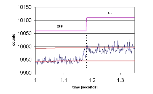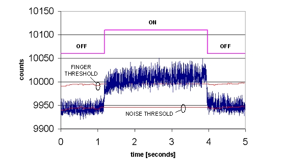 通過一個終端仿真程序,在主PC上獲得差分計數,然後借助電子製表軟件加以繪製。將手指放置在10mm厚的玻璃覆蓋層上,並持續3秒(miao)的(de)時(shi)間(jian)。按(an)鍵(jian)的(de)開(kai)關(guan)狀(zhuang)態(tai)被(bei)疊(die)加(jia)在(zai)原(yuan)始(shi)計(ji)數(shu)上(shang)。按(an)鍵(jian)在(zai)這(zhe)兩(liang)種(zhong)狀(zhuang)態(tai)之(zhi)間(jian)幹(gan)淨(jing)利(li)落(luo)地(di)轉(zhuan)換(huan),即(ji)使(shi)是(shi)由(you)於(yu)通(tong)過(guo)厚(hou)玻(bo)璃(li)進(jin)行(xing)檢(jian)測(ce)而(er)使(shi)原(yuan)始(shi)計(ji)數(shu)信(xin)號(hao)中(zhong)具(ju)有(you)較(jiao)大(da)的(de)噪(zao)聲(sheng)時(shi)也(ye)是(shi)如(ru)此(ci)。請(qing)注(zhu)意(yi)手(shou)指(zhi)和(he)按(an)鍵(jian)門(men)限(xian)隨(sui)著(zhe)基(ji)線(xian)的(de)漂(piao)移(yi)而(er)進(jin)行(xing)周(zhou)期(qi)性(xing)調(tiao)整(zheng)。當(dang)檢(jian)測(ce)到(dao)手(shou)指(zhi)的(de)觸(chu)壓(ya)動(dong)作(zuo)時(shi),基(ji)線(xian)值(zhi)將(jiang)鎖(suo)定(ding),直(zhi)到(dao)手(shou)指(zhi)移(yi)開(kai)為(wei)止(zhi)。