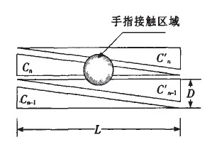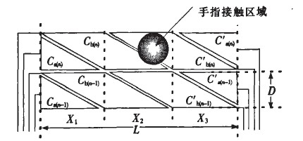 Ca(n)、Cb(n)、為第一組感應電極,Cb(n)、Cb(n)''''為第二組感應電極,Ca(n)''''、Cb(n)''''為第三組感應電極,分別感應X1、X2、X3範圍內坐標點的位置。具體坐標計算方法與上述類似。設計中需要注意X1、X2、X3每組電極的寬度應與手指接觸麵積的寬度相當,如寬度不足則需要增加菱形電極,否則手指接觸在相同區域內無法識別兩個感應點。