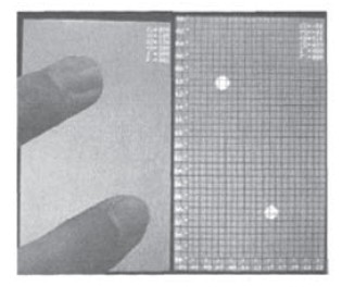 實際電極設計中,每對感應單元設計為多組電極,並根據Lens的厚度設計電極麵積以及間隙大小。間隙過大會導致線縫可見,因此使用假電極進行填充使線縫在30μm以內則可以避免上述問題。經過實際測試,在實現單點觸控基本功能的同時,能夠實現兩點觸控,滿足設計要求。操作效果如圖5所示。