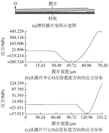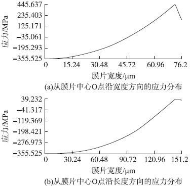 犧牲層厚度H2 < 1.6 μm shi,suizhexishengcenghoududejianxiao,shimopianyuchendiganghaojiechusuojiazaideyaliyesuizhijianxiao,dangxishengcenghoudujianxiaoshigaijiazaiyalijianxiaodaoganghaomanliangchengyalishi,xishengcenghoudubukezaijianxiao,fouzechuanganqizailiangchengfanweineijiangchuxianlefeixianxingxingbian,zheyangbianquedinglejianxiaoxishengcenghoudutigaoguozainenglidejixianzhi。jingguofangzhen,mopianchangdua = 300 μm、寬度b = 150 μm、膜片厚度H1 = 3 μm 時,對應的犧牲層厚度最小值為0.3μm。下麵利用有限元分析軟件對此參數的壓力傳感器進行非線性接觸分析。按照模型建立、網格劃分、接觸對建立、加載、求解的順序進行模擬仿真。當最大應力達到矽的斷裂強度時,加載壓力為1.55MPa,仿真結果如圖4 所示,其中點O 處於膜片中心。