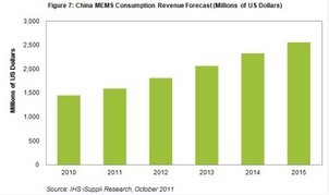 未來幾年,中國市場上增長最快的MEMS領域將是手機與消費市場的麥克風、加速計和陀螺儀。IHS公司預計,2015年該市場的MEMS銷售額將達到13億美元,2011-2015年複合年度增長率為21%。