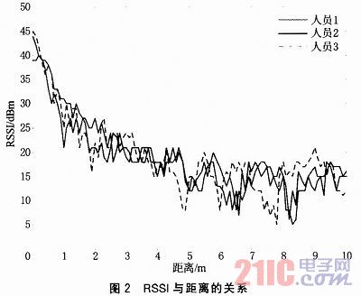 3個工作人員分別拿著移動終端在0~10 m的範圍內勻速前進,得到的RSSI值與距離的關係如圖2所示。