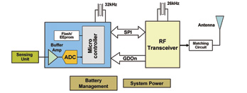 每mei個ge無wu線xian傳chuan感gan器qi都dou被bei看kan作zuo一yi個ge節jie點dian,擁yong有you無wu線xian通tong信xin能neng力li,同tong時shi還hai具ju有you一yi定ding的de信xin號hao處chu理li與yu網wang絡luo數shu據ju的de智zhi能neng。根gen據ju應ying用yong的de類lei型xing,每mei個ge節jie點dian都dou可ke以yi有you一yi個ge指zhi定ding的de地di址zhi。圖tu2顯示了某個節點的通用結構圖。它一般會包括一個傳感裝置、一個數據處理微控製器,以及一個無線連接RF模塊。根據不同的網絡定義,RF模塊可以起到一個簡單發射器或者收發器 (TX/RX)的作用。進行節點設計時,注意電流消耗和處理能力非常的重要。微控製器的內存非常依賴於所使用的軟件棧。