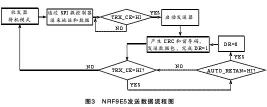 在現代無線通信中,數據都是以數據包的方式來進行傳輸的.對NRF9E5這樣的無線片上係統,每次發送和接收數據也是以數據包的方式進行的.數據包格式是通信協議的重要部分,NRF9E5的無線數據包格式有:Preamble、ADDR、PAYLOAD、CRC.其中,Preamble是前導碼,由硬件自動加上去;ADDR則發送32~40位地址碼;PAYLOAD是有效數據(最大為32bit);CRC是循環冗餘碼校驗和,可以由內置CRC糾檢錯硬件電路自動加上,可設為0位、8位或16位.傳感器節點最重要的工作就是將采集到的數據發送出去.要實現數據的無線發送,必須使處理器中的無線收發器工作在發送模式下.NRF9E5的收發器(NRF905)共有3種工作模式:ShockBurst接收(RX)方式、Shock Burst發送(TX)方式和節能方式,其發送數據流程如圖3所示.