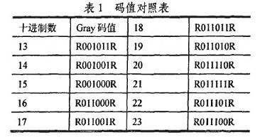 編碼采用格雷碼(Gray)為數值碼,以某一固定碼寬為參考碼R,它用於標尺定位和提高精度。Gray碼是一種絕對編碼方式的無權碼,它所具有的循環、單dan步bu特te性xing能neng消xiao除chu隨sui機ji取qu數shu時shi出chu現xian重zhong大da誤wu差cha的de可ke能neng,其qi任ren意yi兩liang個ge柏bai鄰lin整zheng數shu之zhi間jian轉zhuan換huan時shi,隻zhi有you一yi個ge位wei數shu發fa生sheng變bian化hua,大da大da減jian少shao了le由you一yi個ge狀zhuang態tai轉zhuan到dao下xia一yi個ge狀zhuang態tai時shi的de邏luo輯ji混hun淆xiao,具ju有you較jiao強qiang的de容rong錯cuo能neng力li。以yi6位編碼為例,其部分十進製數與Gray碼的一一對應關係如表1所示。
