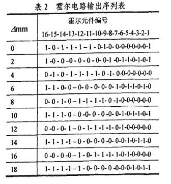 霍爾電路的工作原理是,在外磁場的作用下,當磁感應強度B超過導通工作點時,霍爾電路輸出管導通,輸出低電-半:若曰值低於釋放點時,輸出管截止,輸出高電半。因此在“凸槽”時鋼質活塞杆被磁化,磁感應強度曰增加,霍爾電路導通,輸出低電平,用“1”表示;在“凹槽”時輸出高電平,用“0”表示。以第1個霍爾元件為測量基準,從圖2所示時刻起,位移暈旃次變化b=2mm時,一個碼區行程內霍爾電路輸出的二進製序列如表2所示。分析可知,序列的標識碼為l 0000000 1,其前麵或後麵6位序列數分別為相鄰的兩個數值碼,這使它具有很強的容錯能力。標識碼每隔一個霍爾元件間距N在低位部分右移一位。值得注意的是,標識碼前麵的數值碼代表磁性標尺當前檢測位置下一個碼區的值。