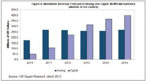 據IHS公司的MEMS專題報告,由於具有對電磁幹擾的免疫力較高和設計階段具有更大的靈活性等優點,越來越多地被用於手機、筆記本以及蘋果iPad等暢銷產品之中,數字MEMS麥克風的銷售額明年將超過模擬產品。