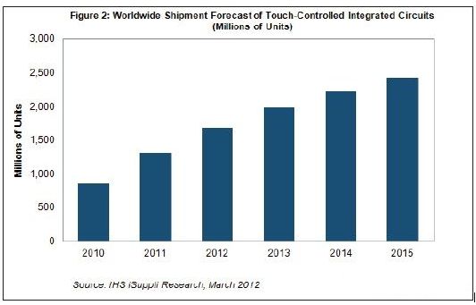 在蘋果公司iPhone和iPad暢銷的推動下,智能手機和媒體平板中的觸控屏急劇增長,從而導致觸摸控製器集成電路(IC)出貨量在短短五年內將增長近兩倍。