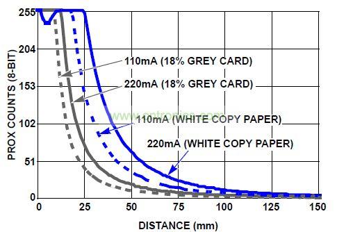 ISL29043是一款低功耗的環境光和接近檢測傳感器,典型的工作電流隻有136μA(110μA用於傳感器和內部電路,約28μA用於LED),這是在220毫安紅外LED電流,點亮脈衝電流持續時間為100μs,休眠時間為800mS的條件下測得的。
