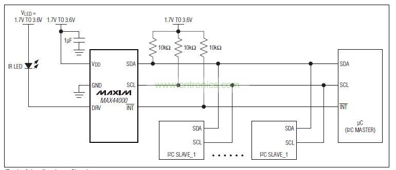 MAX44000設計用於驅動外部IR LED,工作在1.7V至3.6V VDD供電電源。隻有環境光傳感器工作時,器件消耗5µA電流,使能接近檢測接收器和驅動器後,器件僅消耗7µA電流。