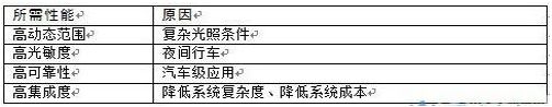 考kao慮lv到dao夜ye間jian行xing車che,有you些xie道dao路lu沒mei有you路lu燈deng或huo者zhe路lu燈deng很hen暗an,汽qi車che視shi覺jiao係xi統tong也ye需xu要yao在zai低di光guang照zhao場chang景jing下xia采cai集ji路lu況kuang信xin息xi。針zhen對dui汽qi車che應ying用yong,圖tu像xiang傳chuan感gan器qi需xu要yao滿man足zu一yi係xi列lie汽qi車che級ji要yao求qiu,如ru寬kuan溫wen度du範fan圍wei、高可靠性、高集成度、低成本等。表1總結了汽車視覺係統中圖像傳感器應該具有的性能:
