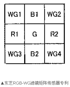 東芝RGB-WG濾鏡矩陣傳感器為改善上述問題,將W像素設置成WG(White Green)像素,並修改了各類像素的排列次序。WG像素兼具W像素的感光靈敏度,又擁有更寬的波長範圍,可同時記錄亮度數據和綠色數據(人眼對綠色最敏感)。從而在正確曝光的基礎上,提高照片的飽和度。