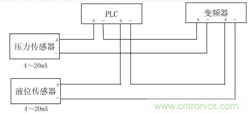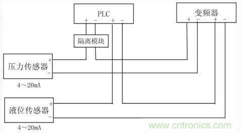 對於傳感器輸出的電流信號,隻經PLC和變頻器的輸入阻抗之和不大於傳感器的輸出負載阻抗即可,壓力傳感器的信號可以同時串入PLC和變頻器,如隻有壓力傳感器信號,則PLC和變頻器也都可以正常接收壓力傳感器的信號。而當液位傳感器的信號也同時接入PLC和變頻器時,因PLC接收信號的-端都在變頻器的+端,當兩傳感器的信號電流不一樣時,就有可能使PLC兩-端的電位有較大的差異,就就形成了共模幹擾電壓。如PLC輸入端又互相不是隔離的,則會造成PLC的模擬信號輸入端接收不正常。變頻器的兩輸入信號是在PLC的後麵,其-端電位可保持在變頻器內部電路設定的狀態,問題不大。
