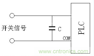 有時PLC或其它控製器的開關量輸入由於受外界幹擾影響而瞬間輸入錯誤,導致PLC產生誤動作,這時在PLC的輸入端並上一個0.1uF的小電容就可以消除這種幹擾,如下圖所示:
