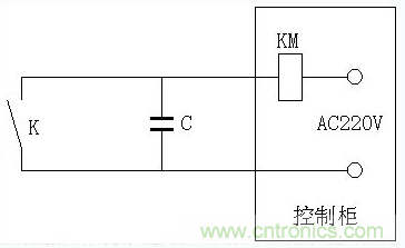 由於開關K離接觸器KM較遠,兩根電線很長導致其分布電容C將變得很大,在交流電路中,這個分布電容中將有位移電流流過,即使開關K斷開也可能因KM維持能量不需太大而導致KM不釋放,設備停不下來,此時,可以按以下方法解決: