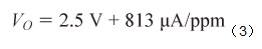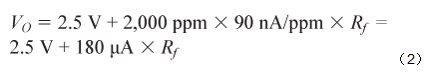 傳感器的最大響應為90 nA/ppm,如表2所示,其最大輸入範圍為2,000 ppm。因此,最大輸出電流為180 μA,最大輸出電壓由跨導電阻決定,如公式2所示。
