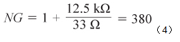 電阻R4使跨導放大器的噪聲增益保持在合理水平。R4的值需權衡兩個因素:噪聲增益的幅度和暴露於高濃度氣體時傳感器的建立時間誤差。對於本電路,R4 = 33 Ω,由此可計算噪聲增益等於380,如公式4所示。