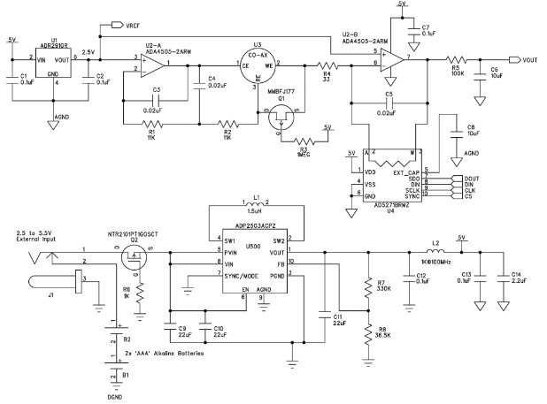 圖2給出了該便攜式氣體探測器的電路。雙通道微功耗放大器 ADA4505-2在恒電位配置(U2-A)和跨導配置(U2-B)下使用。該放大器的功耗和輸入偏置電流非常低,對於恒電位部分和跨導部分都是很好的選擇。每個放大器的功耗僅10 μA,因此電池壽命非常長。