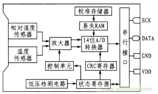 SHT15型傳感器是單片、多用途的智能傳感器,其中不僅包含基於濕敏電容器的微型相對濕度傳感器和基於帶隙電路的微型溫度傳感器,而且還有14位的A/D轉換器和2線串行接口。能輸出經過校準的相對濕度和溫度的串行數據,所以係統中不再使用傳統設計需要的多路轉換開關、A/D轉換器及信號調理電路,係統結構比較緊湊和簡單,SHTl5能在同一位置測量相對濕度和溫度。它的內部結構如圖1所示
