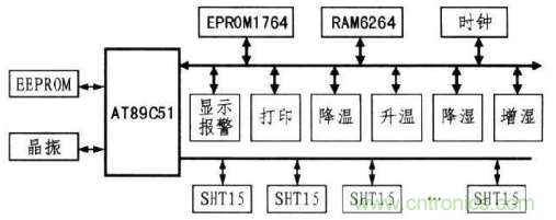 AT89C51和SHT15之間通過串行總線進行通信。執行機構主要由電機控製的降溫機、升溫機、降濕機、增濕機等組成。彈藥倉庫的溫/濕度監控係統如圖3所示。