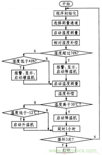 每次測得的數據要和規定值進行比較,如果在允許的範圍內,則程序進行下一步操作,如果不滿足要求.則應報警並將此刻的數據值顯示出來,在每次循環結束後。要經過1個小時(可以靈活選用)的延時.這主要是因為彈藥倉庫裏有很多木製結構,揮發和吸收水分都有一個過程,經過一定延時再進行測量.可以避免傳感器長時間的工作和執行機構的反複啟停,節約資源,同時可以延長係統的使用壽命。每經過3次(根據需要可以適當選擇)循環測量後,單片機控製打印機將3次測量的溫/濕度數據打印出來,便於報表和存檔。