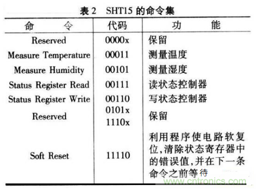 由於SHTl5中含有存儲器,所以設置初始化程序主要是對單片機和SHTl5的存儲器中的一些數據置初值,同時對單片機的初態進行初始化。該係統是多通道的測量係統.SHTl5上電後經過10ms時間就進入休眠狀態,隻有當單片機發出測量命令後,SHTl5才被“喚醒”而進行工作,所以.單片機循環對各個傳感器發出溫,濕度測量命令,實現多通道的溫,濕度測量。SHTl5的命令集如表2所列。