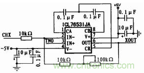 信號放大電路采用ICL7653斬波穩零運算放大器來 完成,如圖2所示。ICL7653具有極低的失調電壓和偏置電流,具有較高的工作穩定性和優良的高精度放大功能。ICL7653斬波穩零使用內部時鍾時, 在CA、CB與CR端之間加上0.1 μF的低泄放、高穩定性的聚酯或聚丙烯電容。同時在雙電源接入端進行濾波和去耦處理。