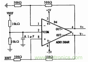 如圖3所示,差分轉換電路以AD8138AR為核心,將單端信號轉換差分信號,既可以提高共 模抑製比,有效減小共模信號影響,又可以驅動SOC內部的24位差分Sigma-Delta模/數轉換器。AD8138AR具有較寬的模擬帶寬(320 MHz,-3 dB。增益為1時),而且AD8138AR為表麵封裝器件,器件體積小,使得ADC與信號輸入點的距離可以很近,大大減少了外界噪聲的影響。