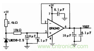 圖4中的基準源LM236輸出的2.5 V電壓經過軌對軌運放OPA340組成的跟隨電路處理後,增大了驅動能力,既作為模數轉換電路的基準源,同時還為差分轉換電路提供中心電壓,以及MEMS傾角傳感器SCA100T的電源輸入。