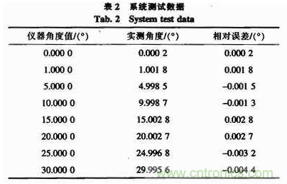 從表2的測試數據可知,每個測試點的偏差有正有負,其主要原因在於這些測試點的曲線擬合是獨立的,互不影響。另外,在30°時絕對誤差最大,最大的絕對誤差為0.0044°,在1°時相對誤差最大,為0.001 8/1≈0.018%。