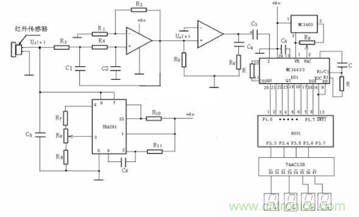 按照上述設計原理,設計的二氧化碳檢測電路如圖3suoshi。gongzuoyuanlishishouxianyouhongwaichuanganqijiangtancedaoeryanghuatanqitidenongdubingzhuanhuanchengdianxinhao,lvbodianlutiqudianxinhaobingshuchudaofangdadianlu,jingguodanpianjixitongchulihoushuchu,zaiyou74AC138送入顯示電路,以實現對二氧化碳氣體濃度的檢測。