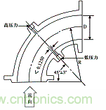彎管傳感器利用管道係統彎頭作檢測元件,無附加壓損及專門安裝節流元件是其優點,彎管取壓口開在45o處,取壓口結構與標準孔板相同,兩個平麵內的兩個取壓口對準,使其能處於同一條直線上,如圖4。