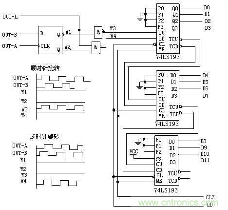 當光電編碼器順時針旋轉時,通道A輸出波形超前通道B輸出波形90°,D觸發器輸出Q(波形W1)為高電平,Q(波形W2)為低電平,上麵與非門打開,計數脈衝通過(波形W3),送至雙向計數器74LS193的加脈衝輸入端CU,進行加法計數;此時,下麵與非門關閉,其輸出為高電平(波形W4)。當光電編碼器逆時針旋轉時,通道A輸出波形比通道B輸出波形延遲90°,D觸發器輸出Q(波形W1)為低電平,Q(波形W2)為高電平,上麵與非門關閉,其輸出為高電平(波形W3);此時,下麵與非門打開,計數脈衝通過(波形W4),送至雙向計數器74LS193的減脈衝輸入端CD,進行減法計數。