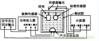 采用間接比較法測量傳感器的靈敏度,在聲場均勻的油腔內,距發射源相同距離處放置標準傳感器和被測傳感器,兩傳感器同時接收換能器發射的聲波信號,用示波器分別測量2隻傳感器的輸出峰值電壓V標和V測,得到V標/V測=M標/M測,即