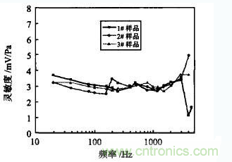 樣品采用北京信息工程學院研製的YLC-A型壓電式微壓傳感器,樣品數為3隻。將傳感器安裝在測試腔蓋樣品架上,輸出端與腔蓋上的樣品輸出引線連接,扣緊腔蓋,按圖1所示連接係統。由於傳感器內裝前置放大器,需提供直流電源工作,電源加在腔蓋上被測傳感器輸出端。調節信號發生器產生正弦信號,信號幅度不宜過大,以避免傳感器輸出失真。取多個信號頻率,分別測量每個頻率點兩傳感器的輸出電壓,在1kHz處示波器上的標準傳感器波形(1)的峰-峰值電壓為145.5mV;被測傳感器波形(2)的峰峰值電壓為5.85V。將V標和V測代入式(1)算出被測傳感器的靈敏度。根據計算結果繪製傳感器的靈敏度隨頻率變化曲線,如圖2所示,得到傳感器的頻率響應範圍。